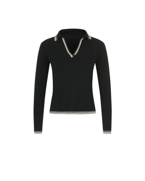 Елегантен трикотажен модел с дълъг ръкав, нормално вталяване и отворена V-яка, с обкантване в черно-бяло райе, съдържа вълнен бленд.