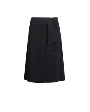 Дамска класическа пола в черен цвят, около коляното, с подплата, вталена с разкрояване по дължината, елегантно допълнение тип текстилен широк колан за завързване