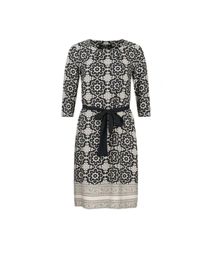 Рокля, изработена изцяло от вискоза, модел с обло деколте, 7/8 ръкав, нормално вталяване, подчертано с текстилен колан, дължина около коляното, подходяща за всекидневен офис стил.