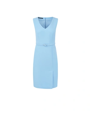 Елегантна бизнес рокля в светлосиньо, без ръкави, с V-деколте, прав силует, подчертана талия с текстилен колан, странична цепка, може да се съчетае със сако от колекцията. В материята е вложен рециклиран полиестер. Употребата на рециклиран полиестер намалява отпадъците и спестява ресурси, като се използват вече съществуващи материали, вместо да се добиват нови суровини. Това води до по-ниски въглеродни емисии и по-ефективно използване на енергия и вода в производствения процес, като същевременно допринася за кръговата икономика.