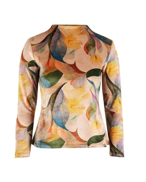 Втален модел с дълъг ръкав, по врата, със стилизирани флорални мотиви, материята има лека еластичност