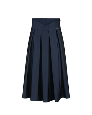 Класическа пола от тъмносин сатен, с висока талия с полегато V-оформление, с плохи, които създават богат А-силует и дължина под коляното, може да се комбинира с блуза от колекцията с V-образно деколте.