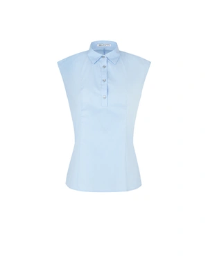 Elegant sleeveless shirt model with a regular fit and a classic collar, in light blue, containing a high percentage of cotton in the composition and offering slight stretch.