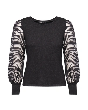 Round neck blouse, regular fit, main material is viscose jersey, with lurex thread, sleeves are made of chiffon with delicate animal motif and cuff