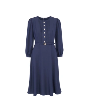 Featuring a round neckline, long sleeves, a fitted top and a flare bottom, length below the knee, with a textile belt, decorative stitching on the front top and gold buttons, lined