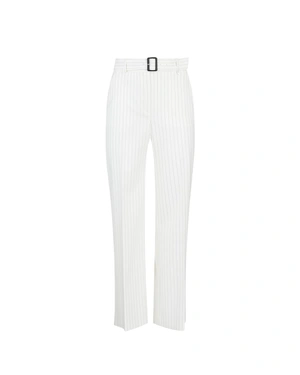 Elegant business trousers with a straight leg and a defined waist with a textile belt, in classic white with fine stripes; can be paired with a matching jacket or a strapped top from the collection.